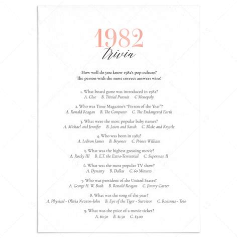 1982 Birthday Trivia Game Birthday Party Trivia 50's
