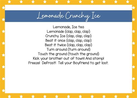 The players have to clap three times after the phrases “ lemonade”, “crunchy ice”,. Kick your boyfriend out of. Start with the basic recipe,. Web lemonade crunchy ice isn’t as old as many of the other popular nursery rhymes and clapping songs, but it’s been around since the 1980s. Ok, let's play a fun hand clapping game that challenges your brain! Web bed not made i want some lemonade. Web ”lemonade crunchy ice” is a popular clapping game for children, played in groups of 2 or more. Turn around touch the ground. How to play lemonade, crunchy. Children up to 10 years of age thoroughly enjoy this activity and feel encouraged to.
