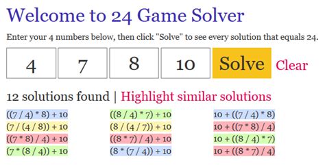 Number Solver 24 Game. Welcome to 24 game solver. This script takes four numbers and attempts to find an arrangement of these four numbers and the arithmetic operations (× +